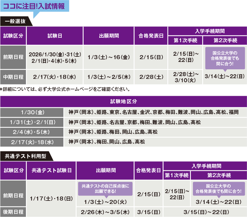 一般選抜の前期日程は試験日が1月末からスタート。最大5日間の受験チャンスがあり、他大学と試験日の重なりが少なく併願しやすいのが特徴です。オプションの「共通テスト併用方式」は甲南大学独自試験に加えて大学入学共通テストの得点で合格判定するため、合格チャンスを増やすことができます。中期日程は、出願期間が共通テスト後でも間に合う日程で、2日間実施。試験日は2月中旬以降なので、受験スケジュールも立てやすくなっています。甲南大学の多様な入試制度をぜひチェックしてください。