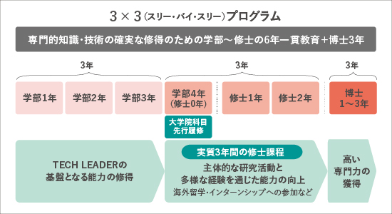 本学は、生物、化学、電子、情報、機械、デザイン・建築など幅広い分野を網羅する工科系大学として、「専門力」「リーダーシップ」「外国語運用能力」「個の確立」を備えた「TECH LEADER」を育成しています。このためには、修士課程を含む6年一貫の教育が必要だと考え、「学士4年-修士2年-博士3年」の学年構造を実質的に「学士3年-修士3年-博士3年」に変更した「3×3(スリー・バイ・スリー)」という教育プログラムを採用しています。これは、学部から修士課程までの6年間を一体として捉え、さらにその後の博士課程3年間を見据えたカリキュラム設計です。学部3年次までに各課程の専門科目、教養科目、英語を鍛え上げる科目などを履修し、専門力の基礎を養い、学部4年次では、卒業研究に取り組みながら大学院科目を先行履修することが可能です。そのため、修士の学生生活に時間的なゆとりが生まれ、海外留学やインターンシップ、研究活動の深化などにあてることができ、充実した学生生活を送ることができます。
